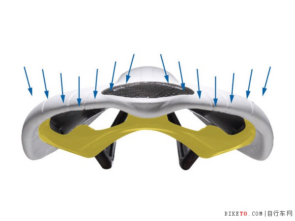 图中黄色区块名为「Vector Wing Technology」,其造型能提供吸收振动的能力,同时加大椅面与骑士臀部接触面积,用以将骑士体重分摊,避免单一位置负担全身重量。