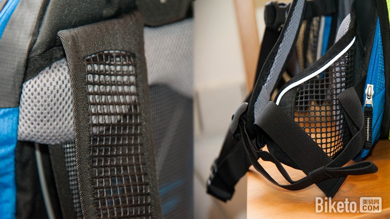 骑行背包针对透气做了两个优化,在人体接触的肩部、腰部等主要部位,使用透气镂空材质;