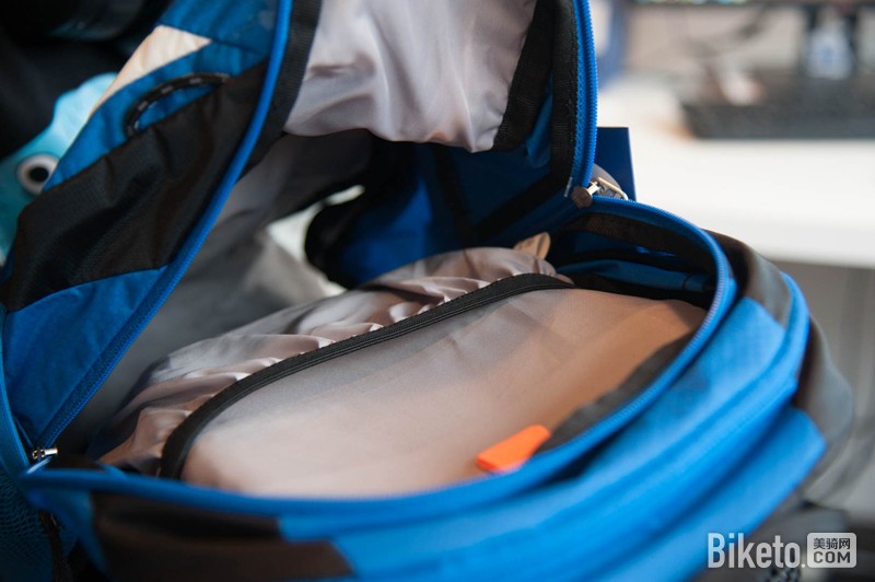 背包的顶部有一个开口,上面写着H2O的字样,这是一个水袋吸管预留口,背包内部有一贴背内格可放置水袋