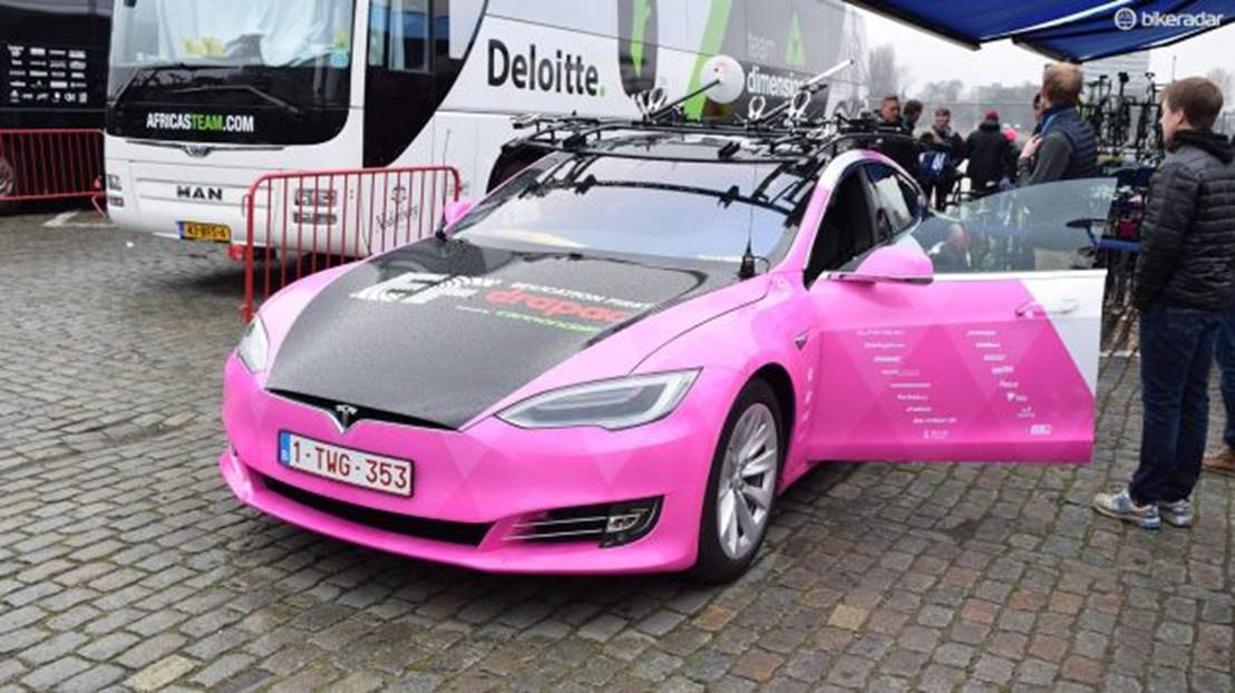 英孚-最派克用了粉色的特斯拉电动汽车作为队车