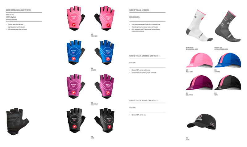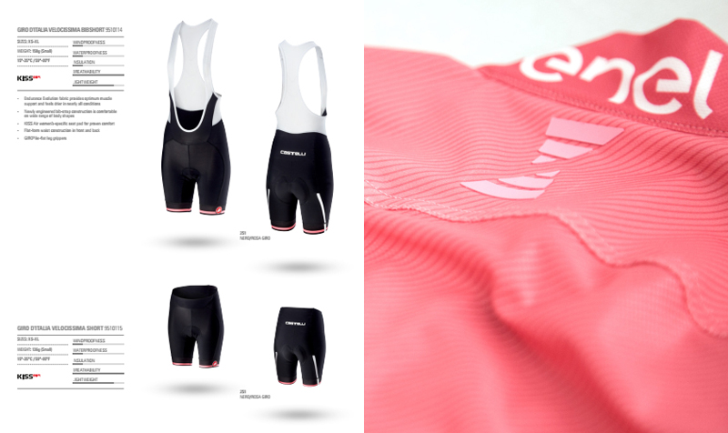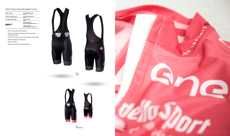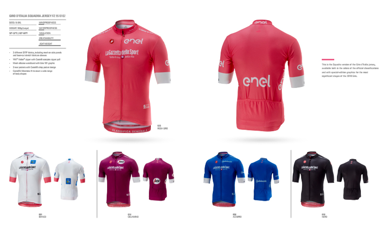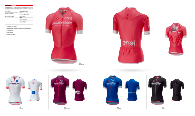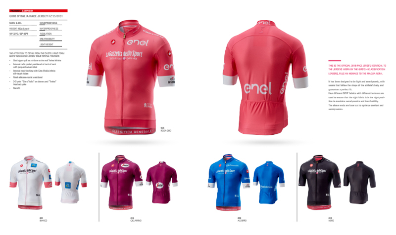 在环意的赛场,Castelli今年推出的四大荣誉衫相继进入人们的眼球,各位明星车手也相继穿上各自的荣誉衫。除粉衫之外,还有蓝衫(爬坡积分),紫衫(冲刺积分),白衫(最佳年轻车手)三款环意纪念衫。以及众多骑行服相关产品,如骑行裤、小帽、手套,还有专门的女款推出。