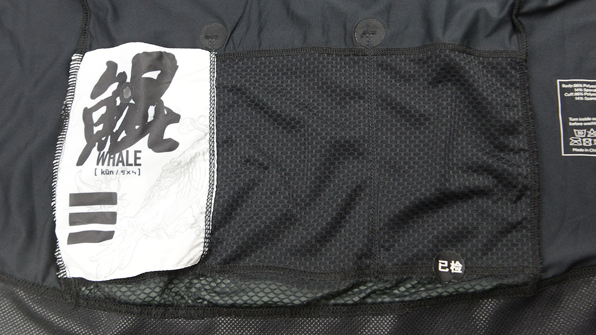 口袋部位的“设计标”,具有浓郁的中国风特色,鲲,不是ikun的那个kun,而是鲸鱼在古代的名字。属于能让老外眼前一亮的东西,但是我看久了,惊喜变化不足(毕竟我有三件基本一样的NEZA骑行服)。