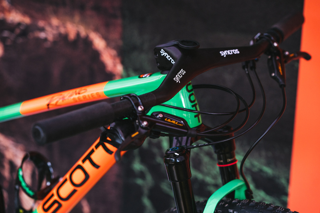 时间来到2018年,尼诺的SCOTT Spark RC 900带来了车迷们见得最多的世界杯涂装,还第一次装配了SCOTT旗下子品牌Syncros的首款山地车一体把Fraser iC SL。