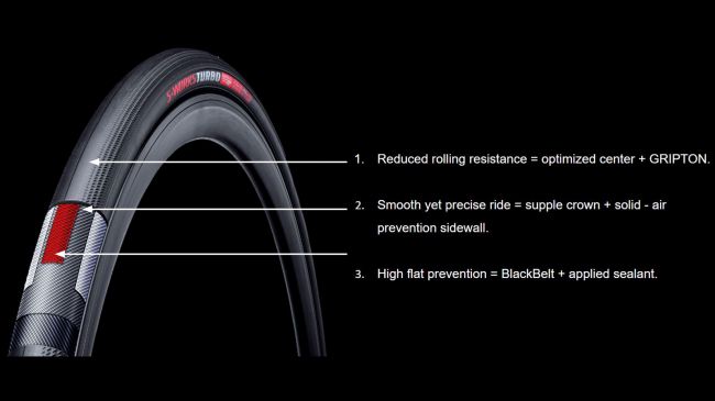 大多数轮胎的胎壁在胎面部分下方重叠,形成三层夹层,并在其下方添加了防刺层。Specialized在胎壁的中央留出一个缝隙,嵌入胎面,然后用Black Belt防刺层弥合该缝隙。通过实验室测试和车手测试(包括在巴黎-鲁贝赛道的最后120公里进行比赛速度的测试)来调整重叠部分和材料的精确混合。