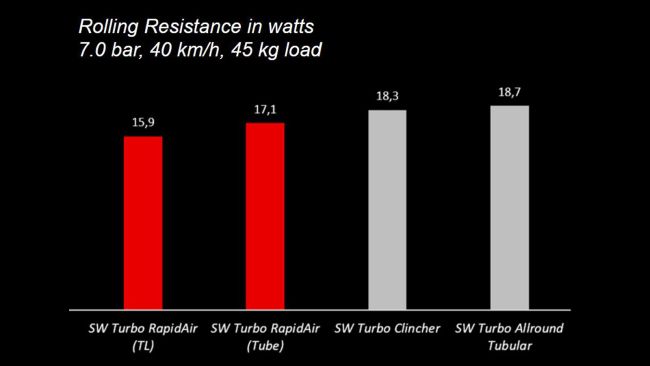 根据Specialized的要求,S-works Turbo Rapidair比S-Works Allround管胎在101psi、45kg负载(相当于人车总重量90kg)下,在40km/h时快=节省2.8w。他们还开发了一种新的混合长丝自补液,该混合物设计用于72psi的压力下,可立即密封长达3mm的孔。