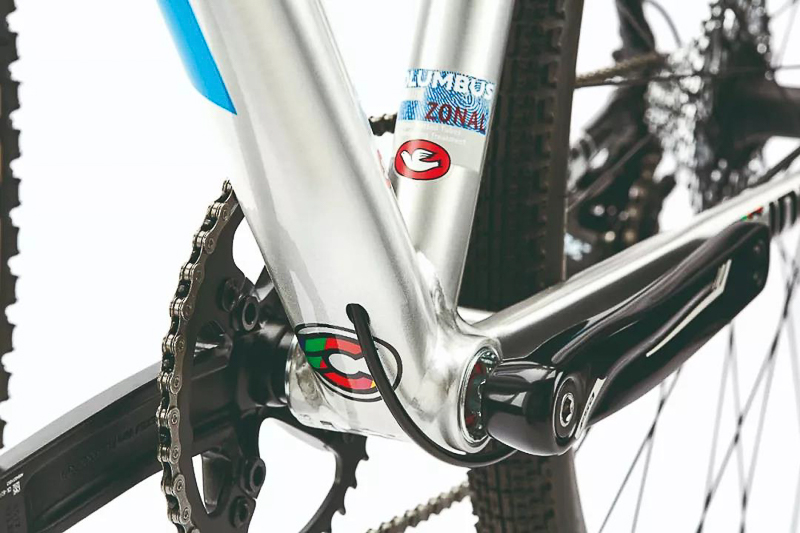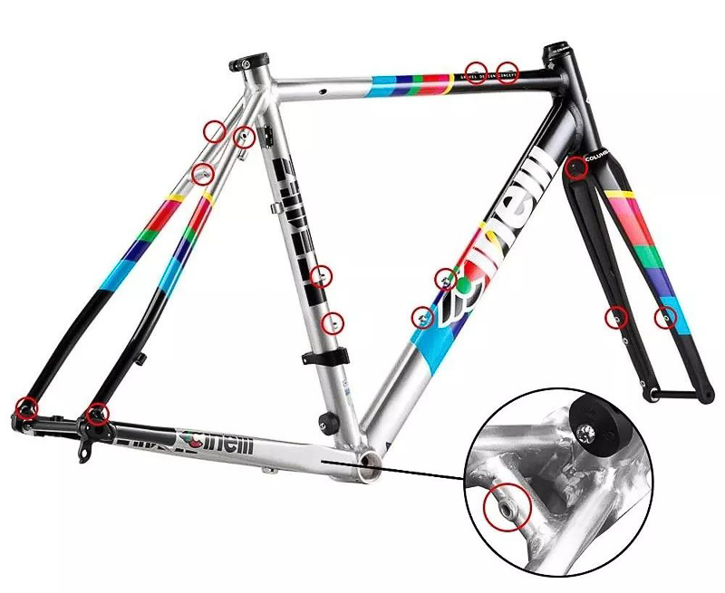 铝合金车架埋管要比碳纤维车架埋管的技术难度高很多,并且在这款车架上几乎看不到埋管的施工痕迹,Cinelli还明目张胆的在这里做了透明涂装的设计,这分明是赤裸裸的炫耀!不愧是意大利的瑰宝,Columbus管材。