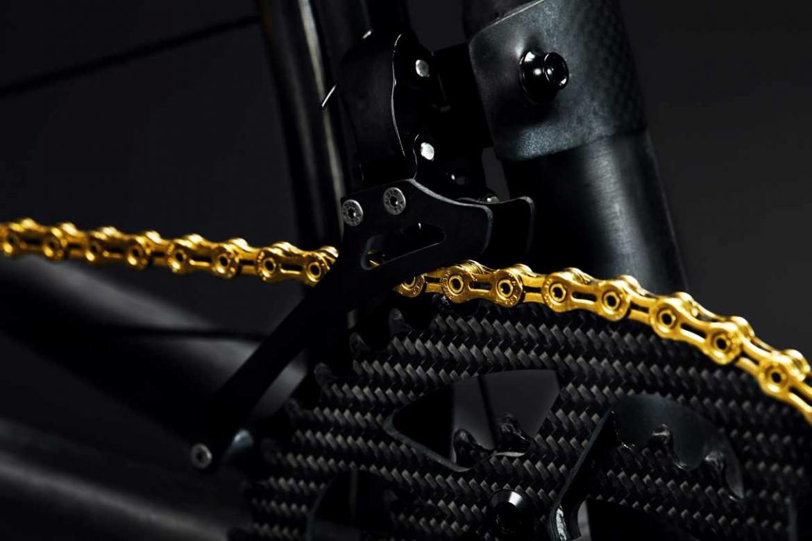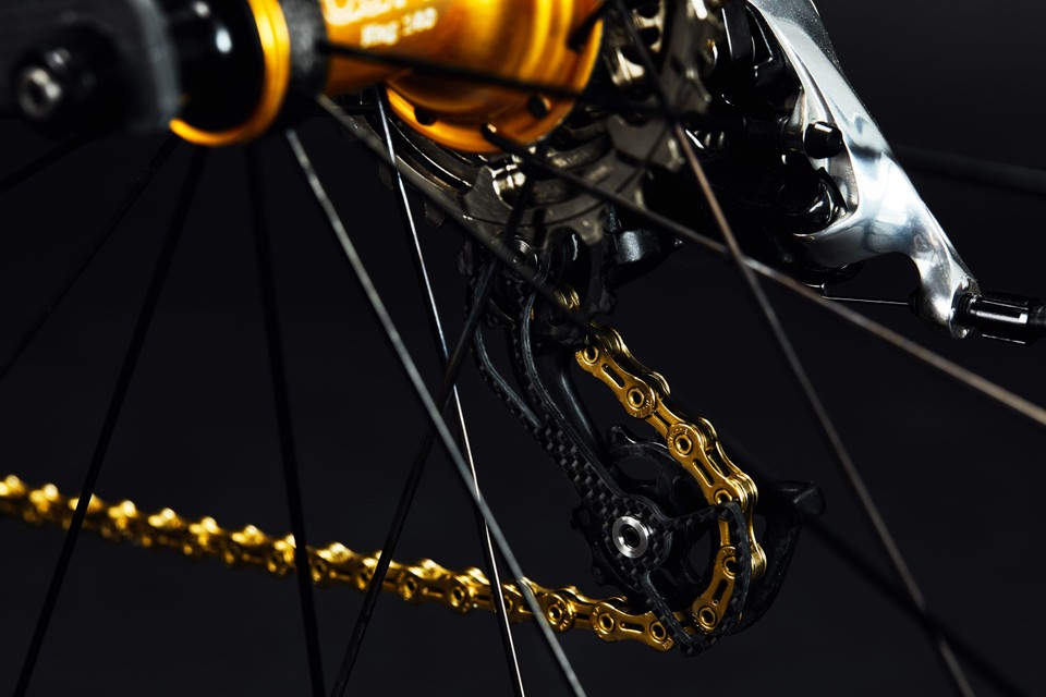 变态级轻量化的车架仅仅只是这辆总重4kg的“羽毛”的冰山一角;首先,这台车使用了一套经过魔改的速联Red 11速套件;更换了碳纤维导轮的后拨以及同样也是定制化碳纤维的手变都节省了些许重量;在前拨方面该车则换用了一套定制过的Tiso Altore前拨来达到极致轻量化(Tiso Altore是一家来自意大利的备受轻量化玩家追捧的超轻量部件制造商)。