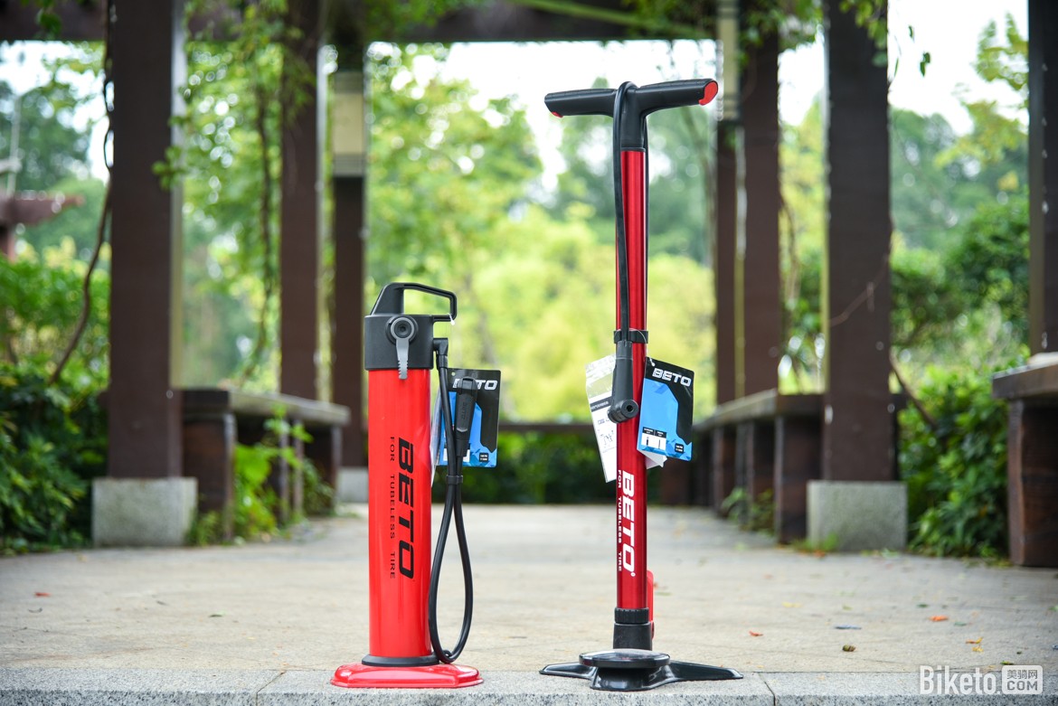 像是BETO旗下的两款储气式打气筒,左侧为JetAir储气筒(型号:CJA-001S),右边为One For All立式储气/打气筒(型号:CFL-003AGD)。这类带有储气功能的打气筒/储气筒可以帮助我们将真空胎快速安装到位。