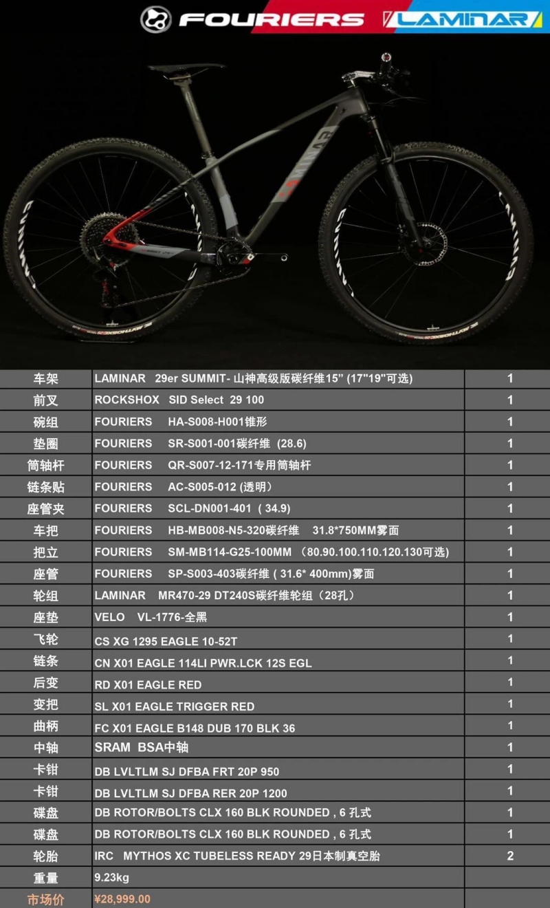 LAMINAR SUMMIT 29(山神29)是力敏纳的经典款碳纤维山地车型,搭配了近年来专业山地车比赛中最为流行的29er轮组规格,除了稳定性佳以外、兼具备无与伦比的抓地力和突破各种障碍的能力,在越野时提供了强韧的前叉刚性,让你可以尽情享受每一个林道冲刺与跳跃的体验。