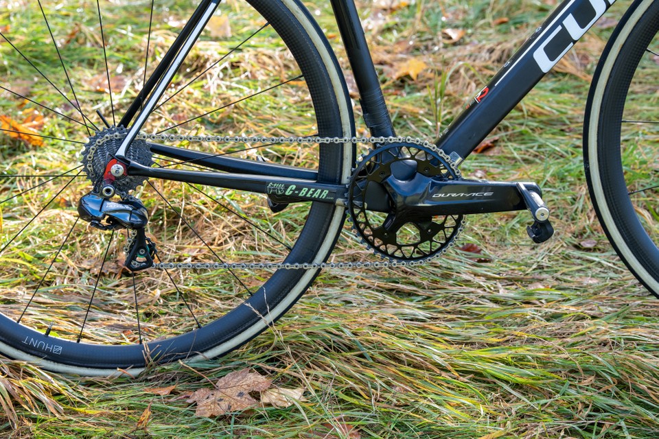Josh使用Dura-Ace曲柄搭配Ultegra Di2后拨的组合,椭圆单盘装配在盘爪外侧。