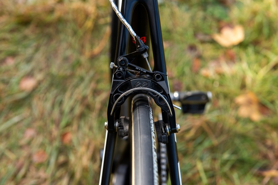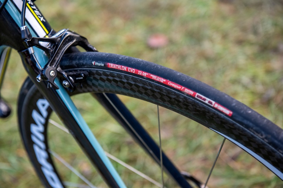 前轮装配有一条Vittoria Triathlon EVO外胎,这条比装在后轮上的Vittria Corsa EVO要轻,但Mary发现Corsa在湿滑路面的抓地力要更好。