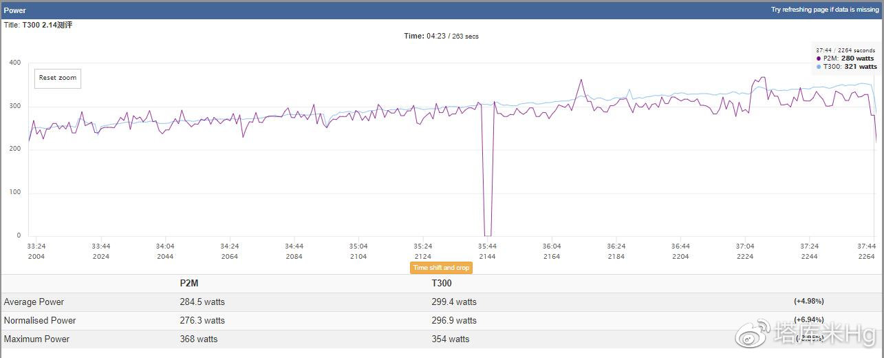 但是把时间拉到第36分钟到第40分钟左右,这时候T300的功率出现了开始偏高的现象,不过并不严重,P2M的AP为268.6w,T300的AP为277.8w,误差在3.3%左右。