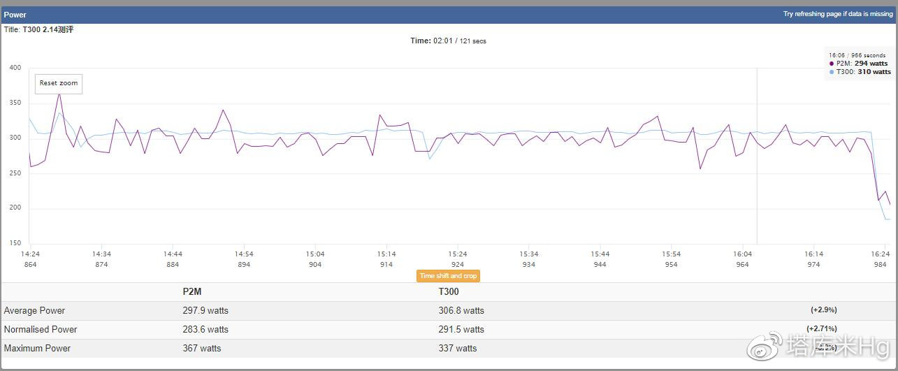 14-16分钟,这两分钟左右的骑行,P2M的AP为298w,T300的ap为306.8w,误差也在3%以内。