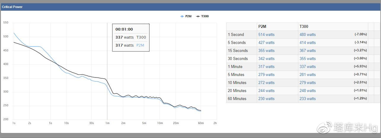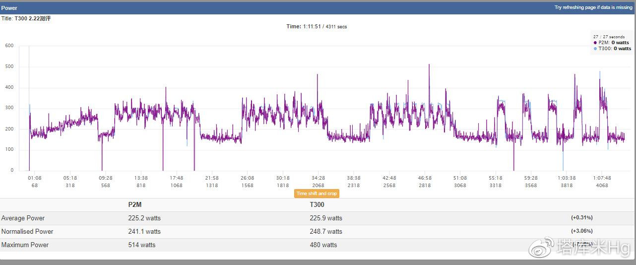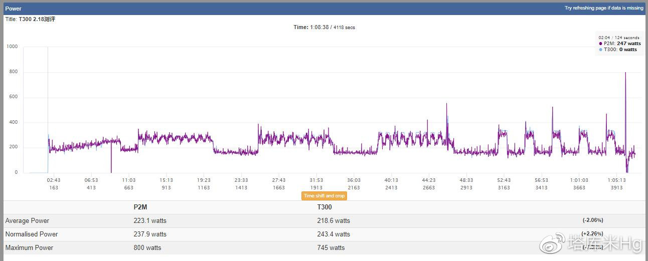 这两段就比较有意思了,T300在长时间骑行之后出现了差值增加的情况,P2M的AP为311.7w,T300则为332w,两者差值达6.1%。