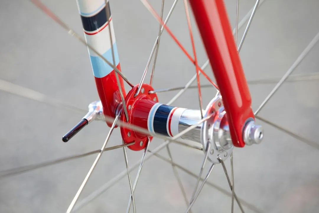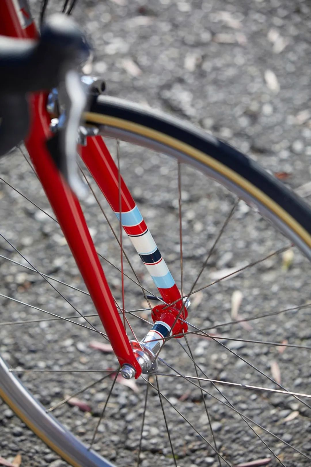 如此以外,该车的轮组也十分个性,其使用手工抛光的HED Belguims轮组搭配Chris King银色花鼓,并且花鼓也做了与车身一体的烤漆,为了细节的完美,可谓不惜成本。