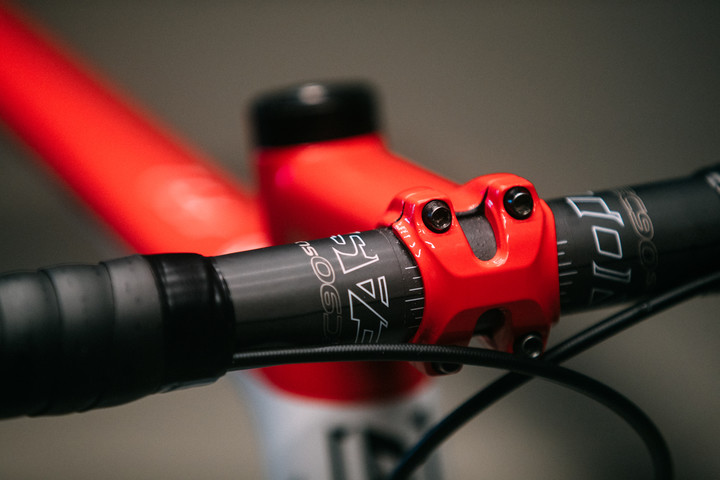 把组是Easton EC90 SL 44cm碳把,搭配已停产的110mm /8°Giant把立(新款Giant把立为0°和10°)。