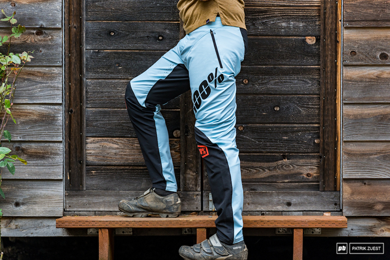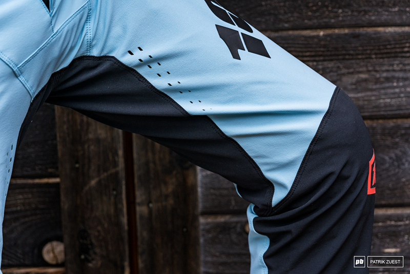 裤子由聚酯/氨纶四向拉伸面料制成,DWR涂层。其最大特点是腰部调节——BOA旋钮。裤腰内部有硅胶防滑带,在大腿内侧和膝盖后方有激光散热孔,辅助通风。有两个拉链口袋,右边口袋里有个小的内部“稳定口袋”,以防工具滑动。