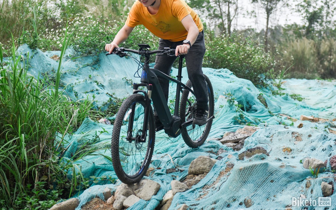 轻度山地越野过程中,实际上因复杂的地形和频繁的加减速。很难保持平稳的连续踩踏,此时档位搭配和后拨变速器搭配非常重要。整车搭配的SHIMANO DEORE变速相当靠谱,无论是乱石还是落差,各种颠簸路况都能胜任。