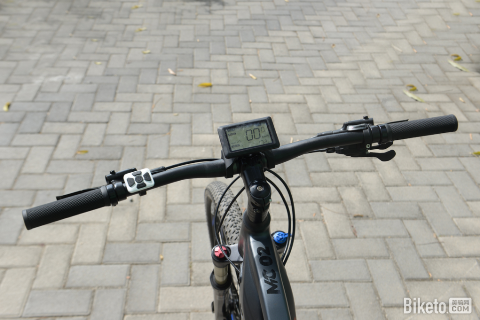 车把是一支700毫米宽度的铝合金小燕把,这也是当下山地车相对主流的选择,在单盘时代,山地车把普遍崇尚线越少越好的简洁风格,而电助力山地车却因为需要放置操控按钮、屏幕,没有办法满足这类“强迫症患者”的要求,不过好在按钮以及屏幕的设计并不浮夸,整体造型还是比较简约的。