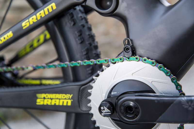 ▲这是BLACKBOX的功率计,我们已经看到了本赛季很多XC赛车配备了这个功率计,一个简洁的防掉链器,齿片为38T。