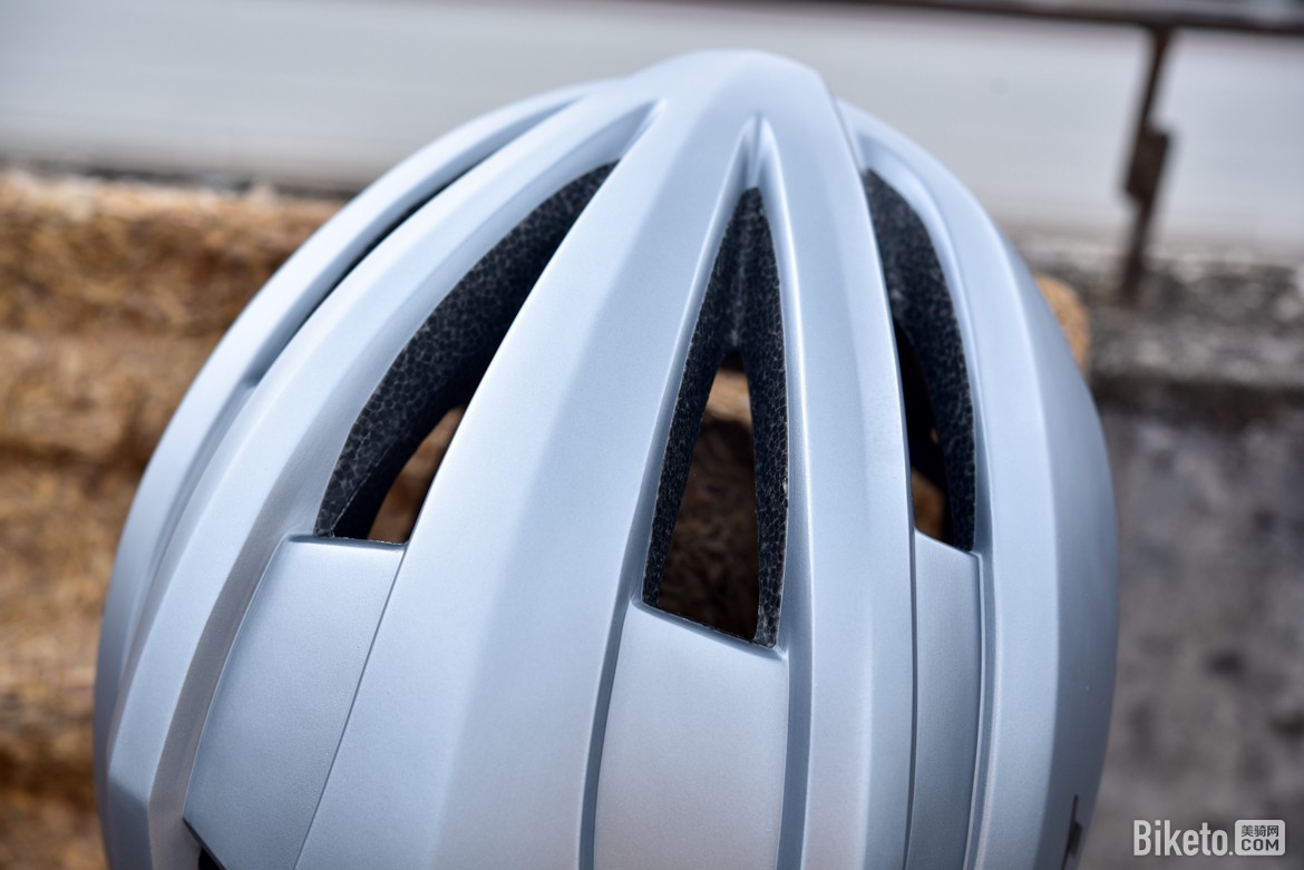 这款头盔采用了In-mold一体成型技术,简单讲就是把头盔PC和聚苯乙烯材质EPS通过高温融合的技术,这样做的好处是在融合的过程中能够更好地对透气孔位定型减少风阻。