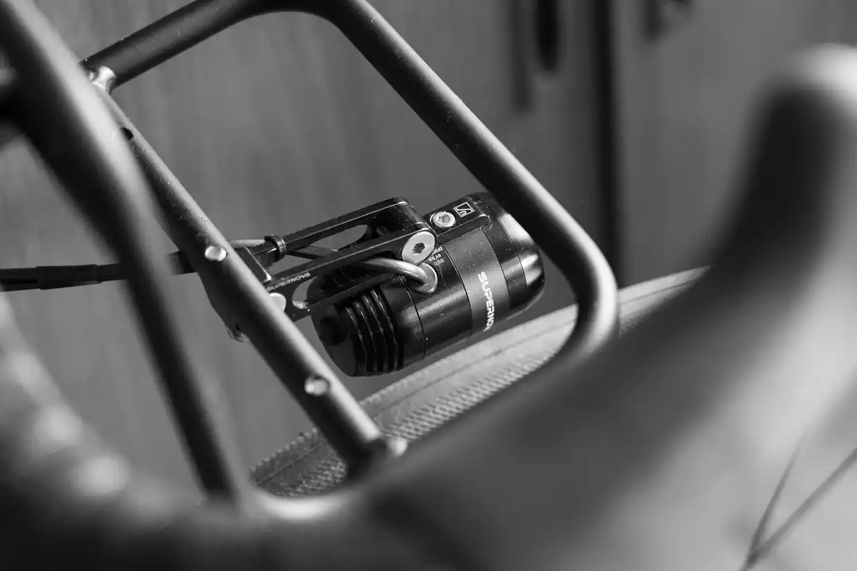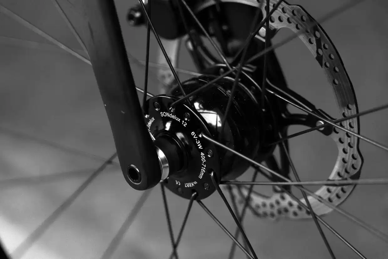 Nohlin:“车架组是S-Works RFP (Ready for Paint,即无涂装版),尺寸为56cm。这意味着碳纹裸露在外面,可以自由定制涂装。由于这台车的用途定位是长距离骑行,那么发电功能的设置是必须的,我的库存有SONdelux发电花鼓和Supernova车灯。28孔花鼓可以打造非常强劲的轮组,虽然不是最轻量化的,但很坚固。”