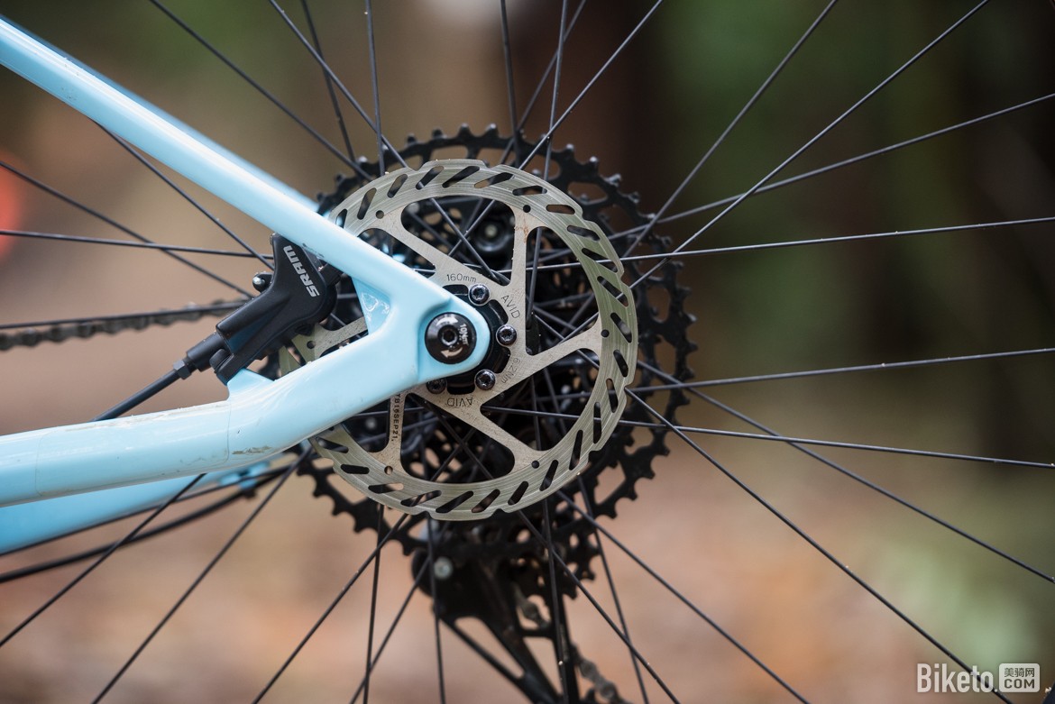 制动系统则是SRAM Level双活塞液压碟刹,搭配180mm/160mm G2碟片,制动力强劲。尾钩也使用了最新的UDH规格,日后升级全新的SRAM无线电子变速也非常方便。