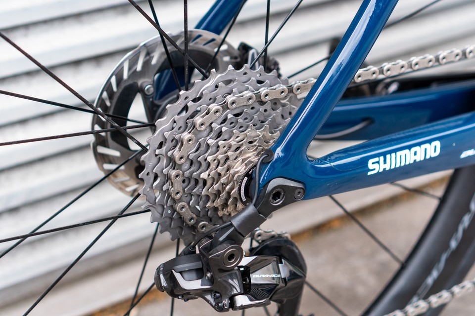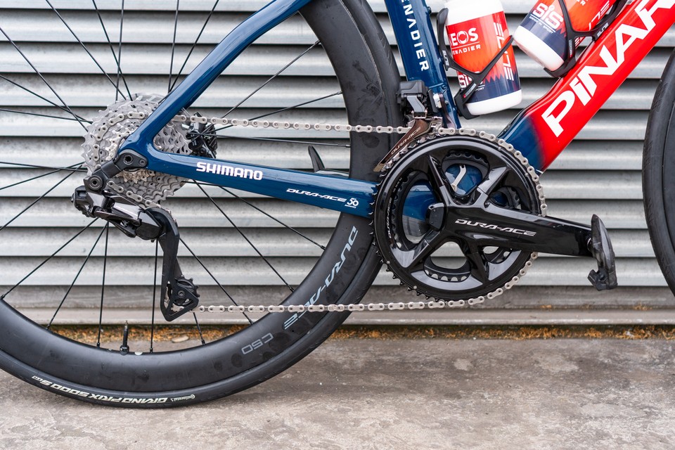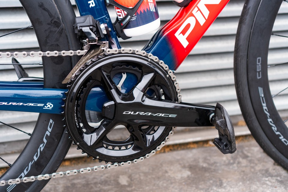 在2023环法S1(毕尔巴鄂绕圈赛)中,贝纳尔使用的是54/40T牙盘搭配11-34T飞轮,他并没有使用齿比范围较小的Dura-Ace 11-30T飞轮。他的锁踏和功率计同样也是Dura-Ace套件,K-Edge防掉链部件安装在前拨上。