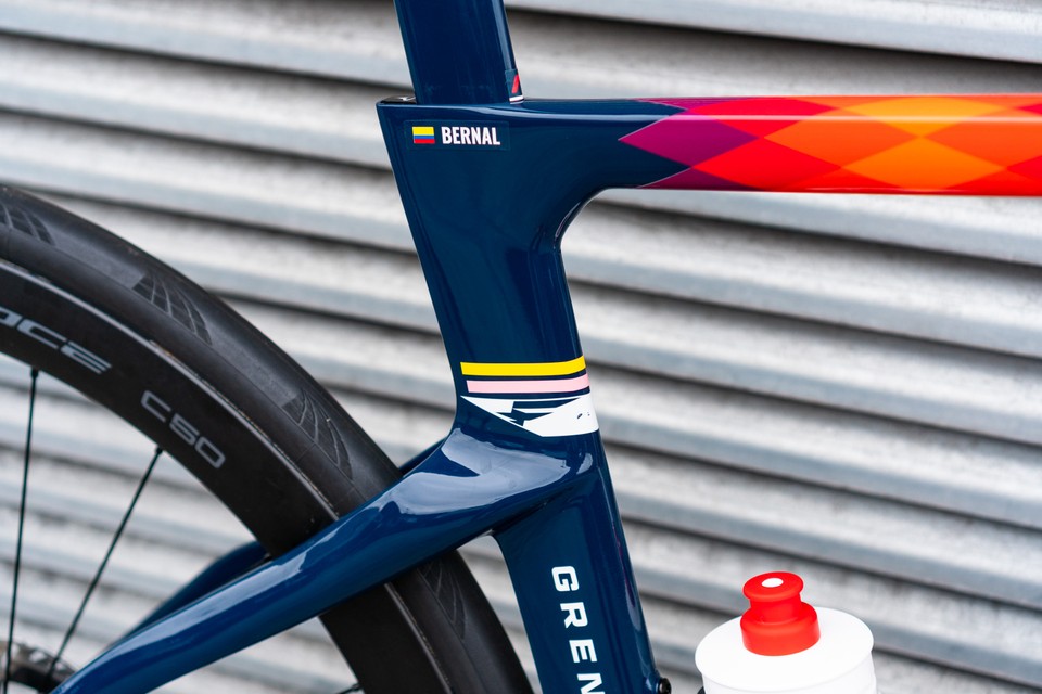 经过测量,贝纳尔的这辆Pinarello Dogma F重量为7.385公斤,且是在不拆除任何部件的情况下。对于一辆大组赛自行车而言,这个重量无疑是很有竞争力的。身高175厘米的贝纳尔骑的是一辆中码的车架,按照Pinarello“特立独行”的标准,它中码的车架肯定和其它品牌有所不同。