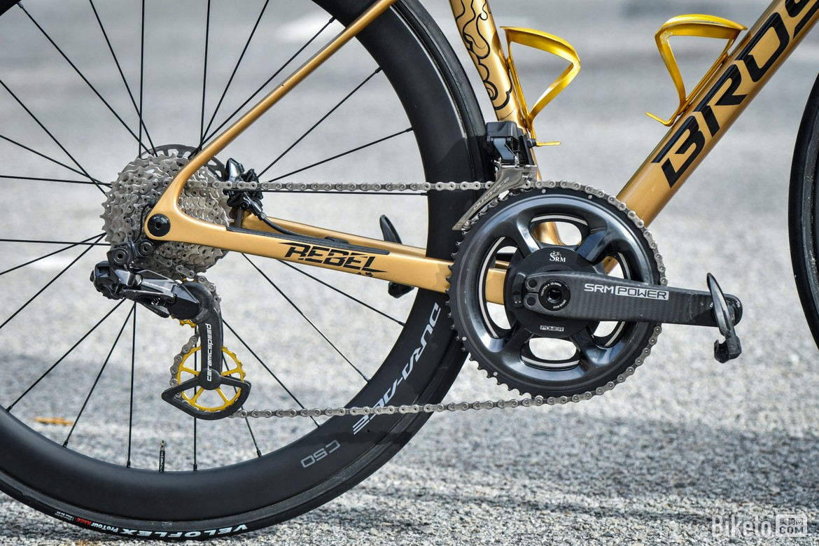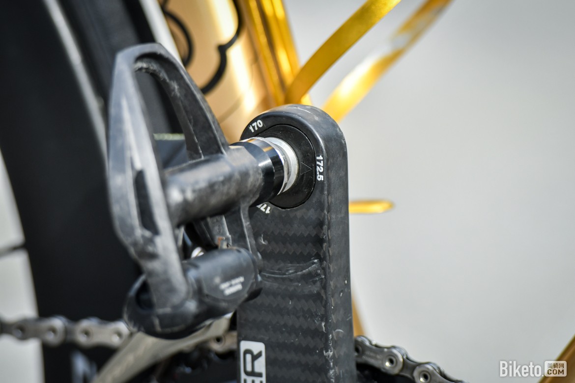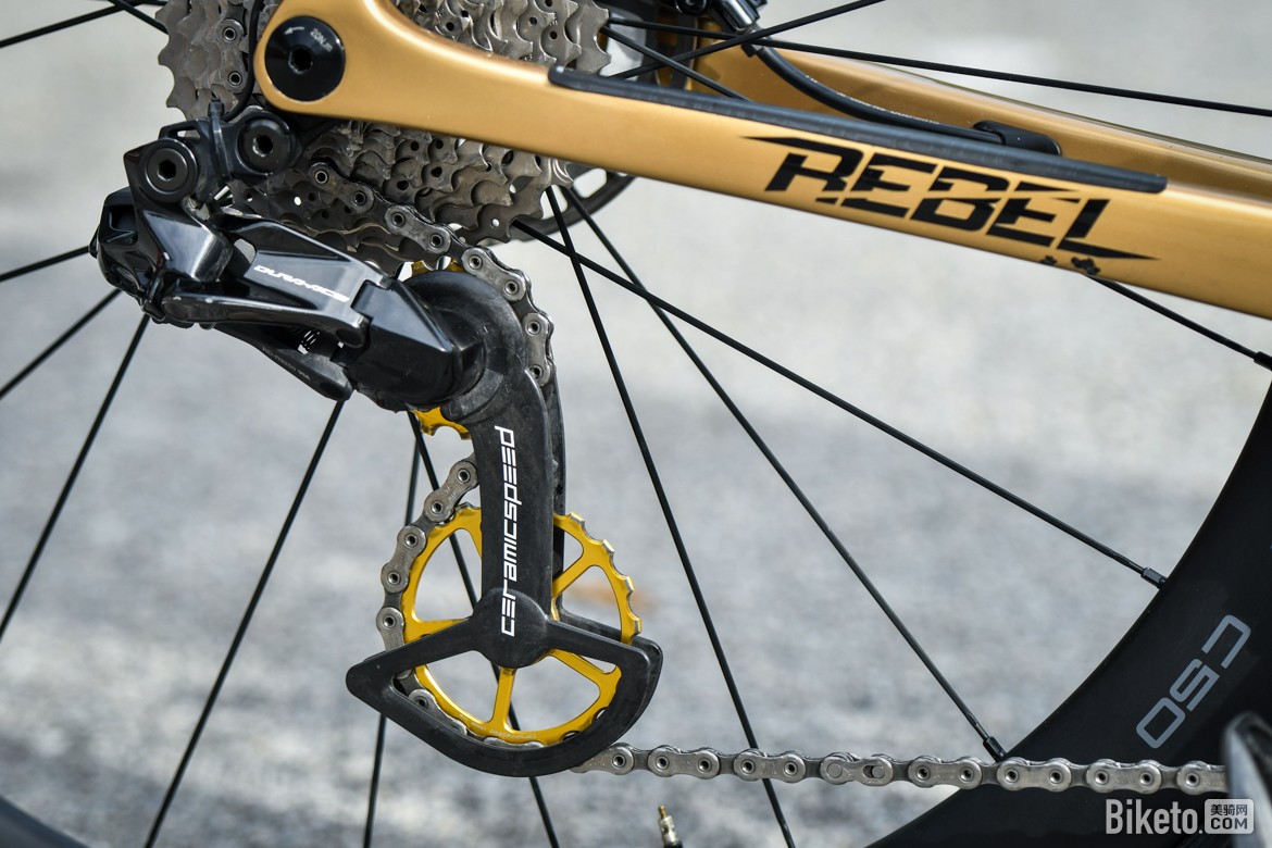 ▲队内标配CeramicSpeed大鸡腿,为了更好地搭配整车涂装,白老师车上的是金色版本