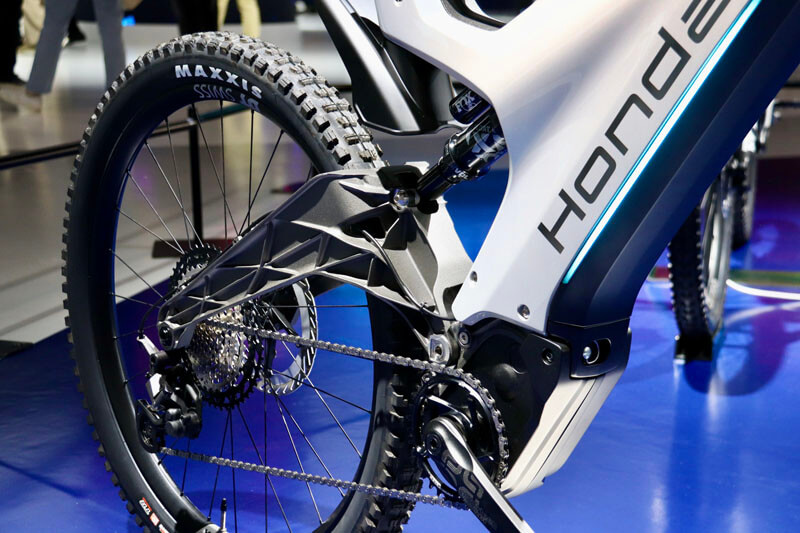 本田电助力概念山地车的后臂形状和减震装置与当年的RN-01非常相似,前三角的整个摆臂机构都被树脂部件覆盖。不过这款电助力自行车使用的是铸造铝后臂。根据本田官方的新闻稿描述,这台电助力山地概念其独特的车架和后臂采用与该公司的CBR-1000等高性能摩托车中使用的相同的由薄壁铝铸造技术制成。再加上独特的车架设计,实现了功能和造型的完美融合。
