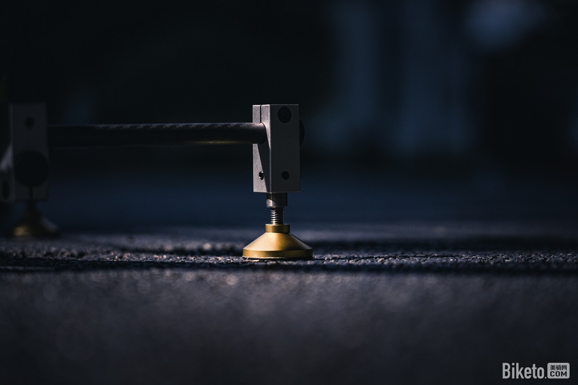 特别值得一提的是,碳纤维版的脚撑部分都采用阳极氧化的香槟金配色,下方配备了独有的黑色防滑垫。整个脚撑使用高精度CNC一体加工,磨砂外表极具质感,色泽持久耐磨,不易褪色,为整体低调的碳黑质感增添点缀,使得停车台更具辨识度。