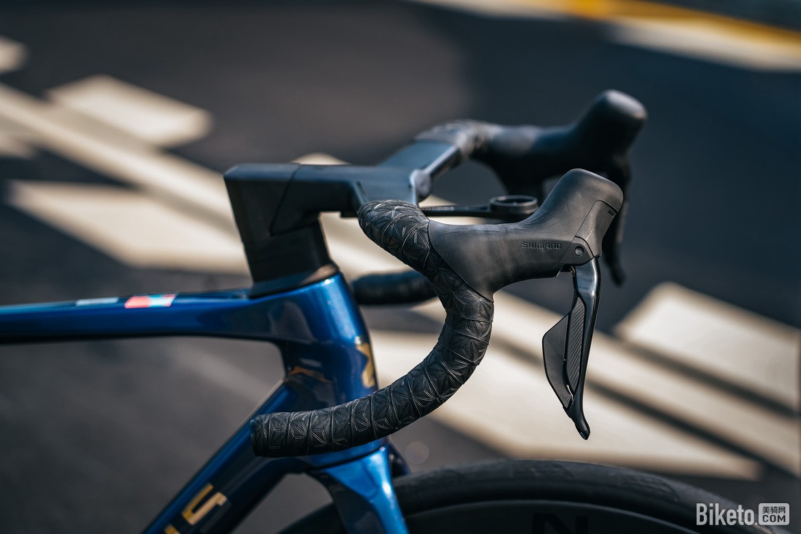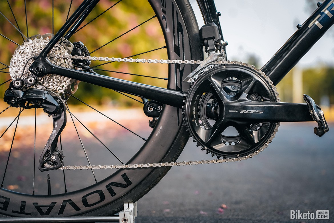 样车为Shimano 105 Di2配置整车,配备全套105 Di2套件。由于是偏向爬坡的车型,所以配备了50/34T盘片+11-34T飞轮,为用户提供更加充足的齿比。