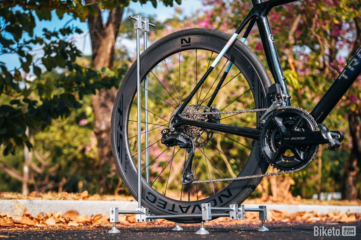 轮组搭配比较特别,使用的是NOVATEC诺飞客R5,具体规格为D411/D412花鼓搭配27.7mm外宽轮圈版本,重量为1440克。