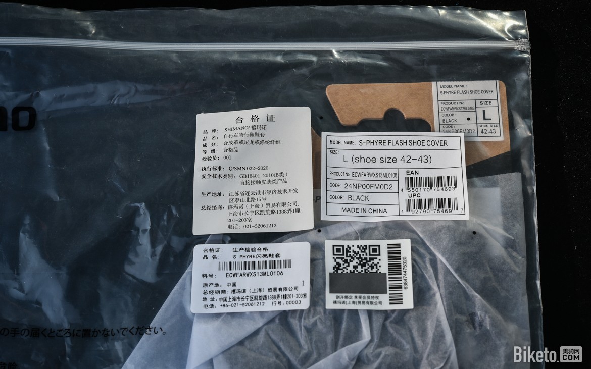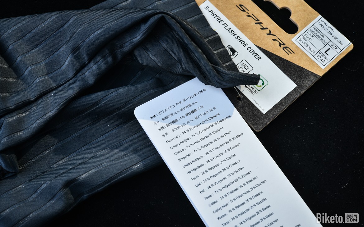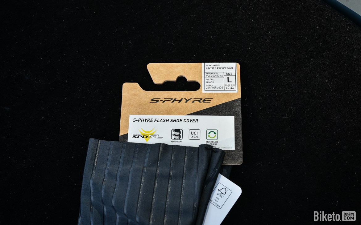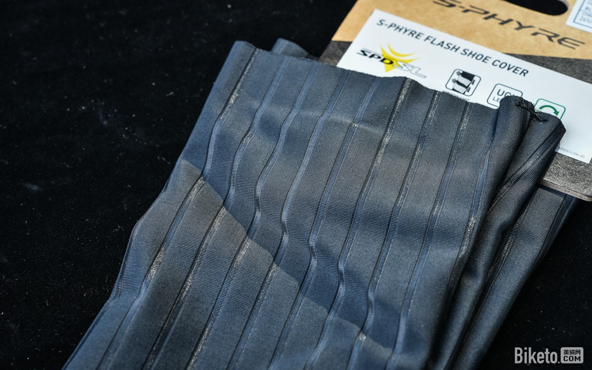 一看标签,原来是S-PHYRE FLASH鞋套,应该是和FLASH骑行袜一样,是偏向气动的产品了。中文官方译名十分简单粗暴,就叫闪亮鞋套……码数则与骑行袜有些差异,L码对应42-43鞋码。