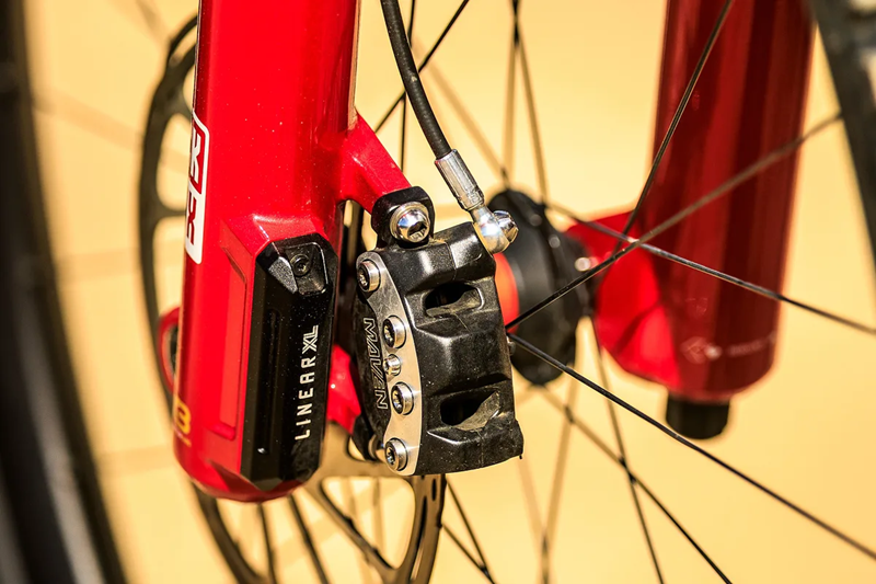 在前叉立管底部有一个神秘的凸起,标有"Linear XL",这可能是一个微小的附加气室,为压缩空气在行程末端提供更多空间,从而减少气压上升率。