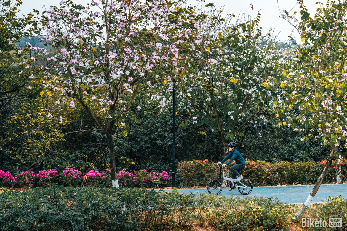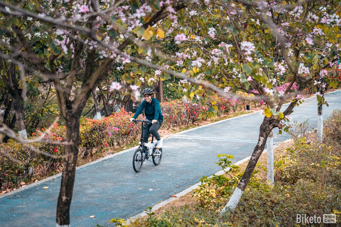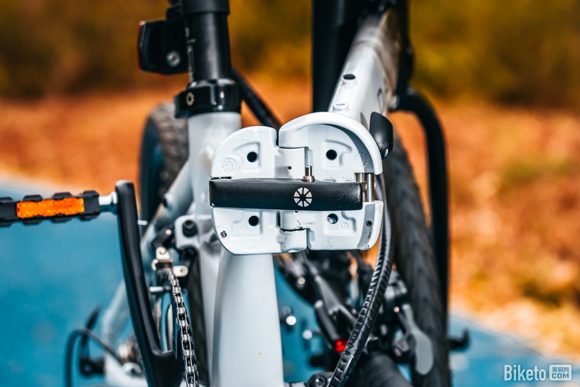 整车折叠后尺寸为长82cm、宽36cm、高67cm,折叠体积十分紧凑。马甲线设计丝毫不影响折叠流畅度,刹车、变速走线整合有序,外观整洁利落。