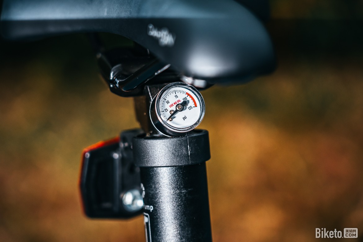 另外这次的打气筒甚至还配备了气压表,能直观地知道气压,最高可达到125psi。