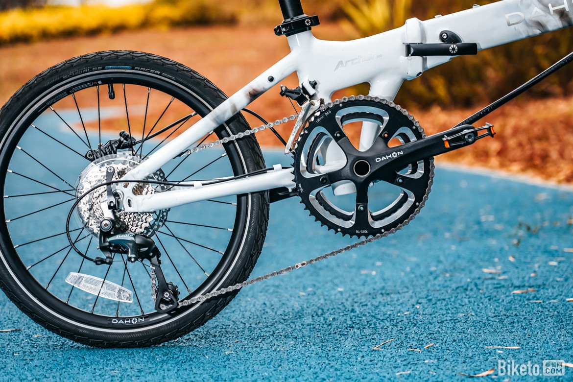 传动系统方面,ARCHER PRO搭载SHIMANO TIAGRA前2后10变速系统,换档精准流畅,20速的变速范围可以适应户外99%的地形。搭配DAHON定制46/56T中空一体链盘与SHIMANO 11-32T后飞轮,起步十分轻快。
