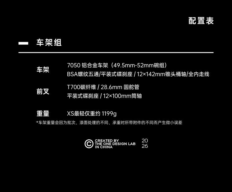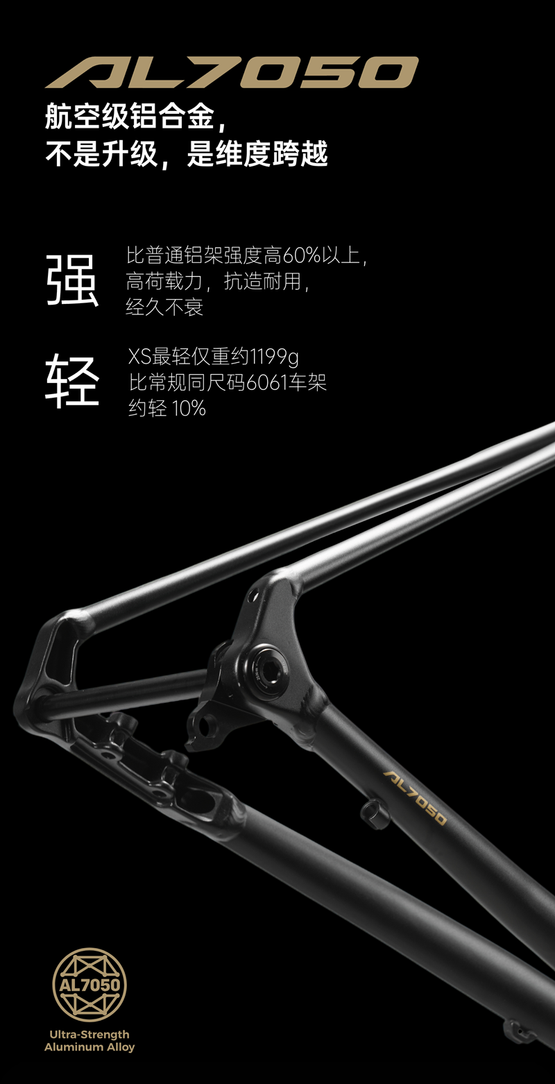 ·车架最轻仅重约1199g,采用高规格航空级7050铝合金,成本直逼碳架,比普通铝架强度高60%以上,抗造耐用,经久不衰。