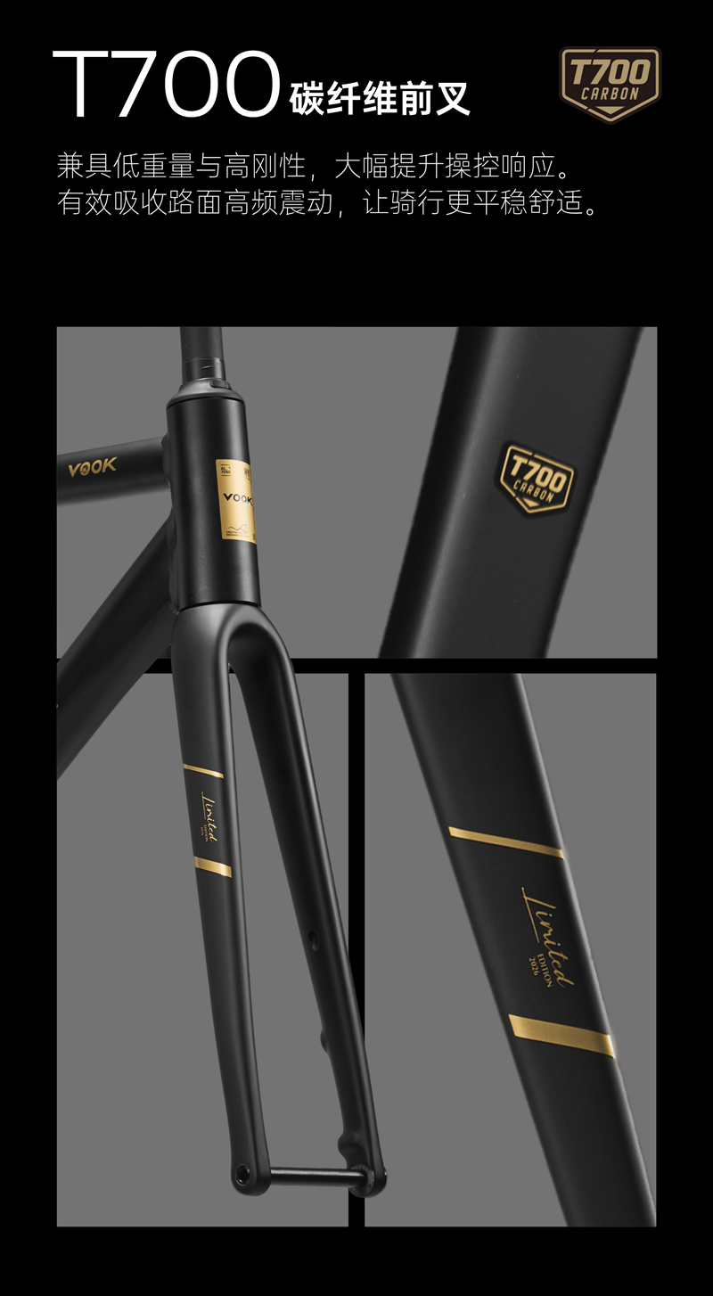 ·T700碳纤维前叉,低重量高刚性,有效吸收路面震动,让骑行更平稳舒适。