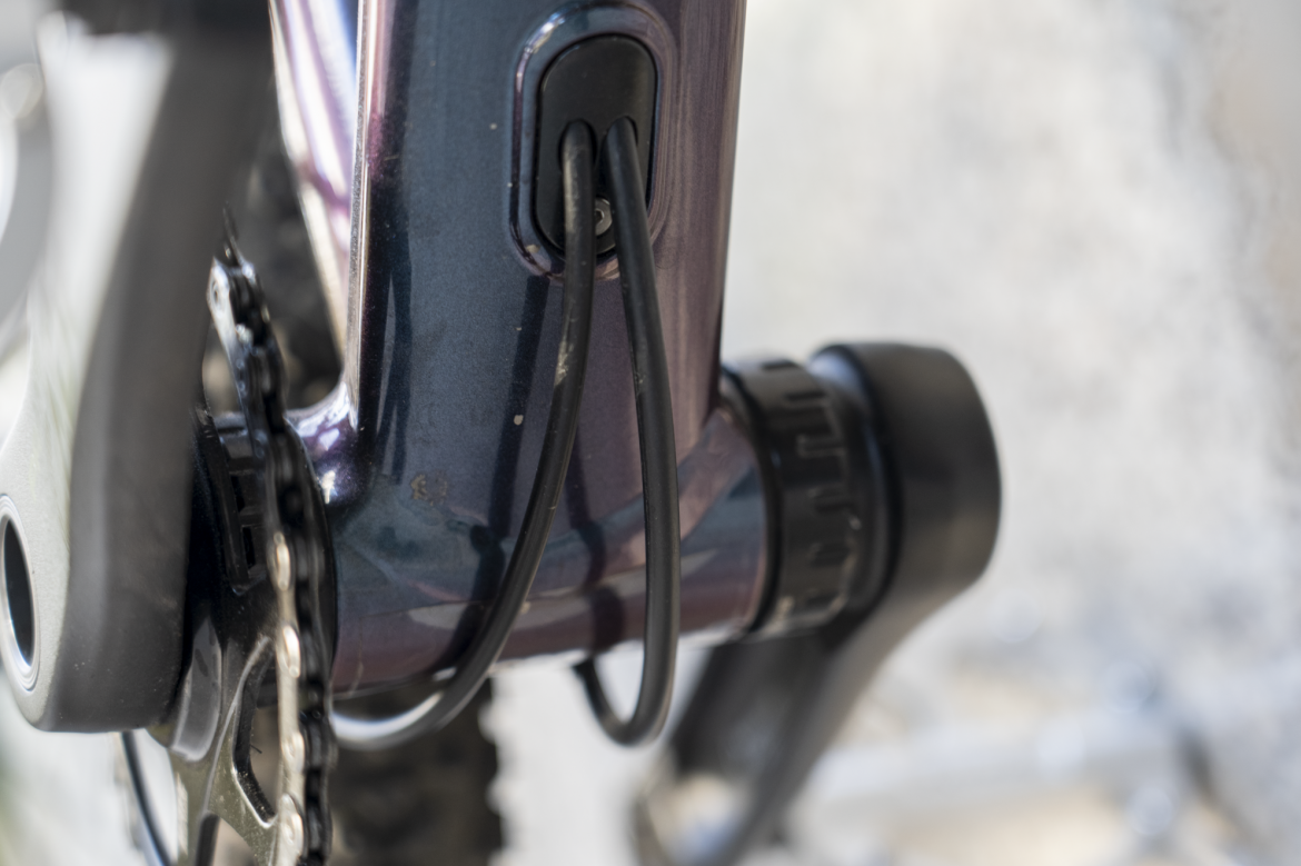 ti205s头管角度70度,立管角度73.5度,reach为380 ,后叉开档有点遗憾,是142开档而非boost 开档,整体车架几何还是比较保守。车架在三通那有补强设计并隐藏掉了部分焊缝,车架头管处和刹车座均采用了鱼鳞焊,出线孔均有出线盖板的设计,开孔角度也和正常走线一致,取下盖板后孔位够大,安装隔音条也非常方便。