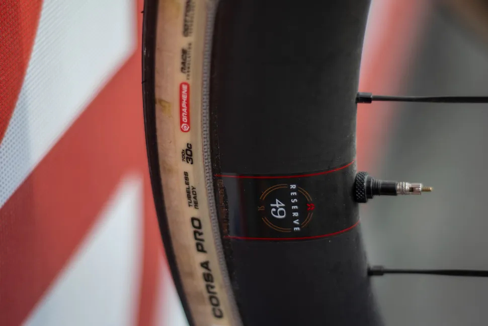 布伦南使用30mm Vittoria Corsa Pro真空胎,搭配Reserve 42mm框高前轮圈。可见气嘴处胎唇似乎涂有胶水,这可能是维斯马车队的保险措施。