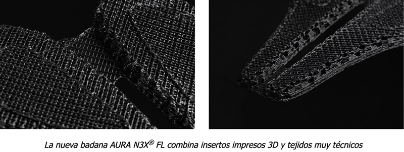 AURA N3X® FL的构造完全不使用泡沫和层压材料,取而代之的是由3D打印件和三维技术面料组成的结构。这种方法允许在设计阶段直接定义裤垫的性能参数,而非依赖于材料的层层堆叠。