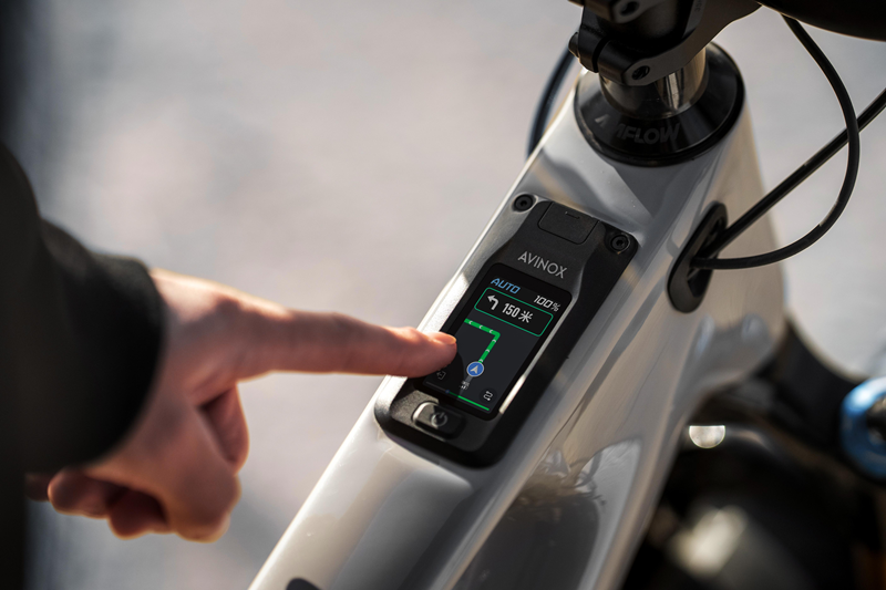 Amflow 车架上直接集成了一块 Avinox 全新的 2 英寸全彩 OLED 触摸中控屏,用户可以在屏幕上对车辆模式、功能进行直接操控,实时查看骑行数据、预估续航里程和选择骑行模式等,骑行状态随时一目了然。