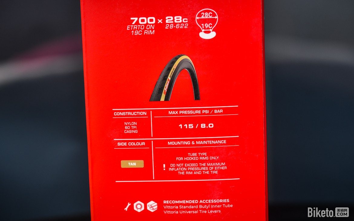 纸盒后面是一些规格参数,Zaffiro Evo在最常用的25c和28c上多提供两个棕边配色,全部规格均提供黑边。作为一款入门开口胎,胎帘为60 Tpi,胎压限制为115 Psi,自然也是不支持无钩圈的。