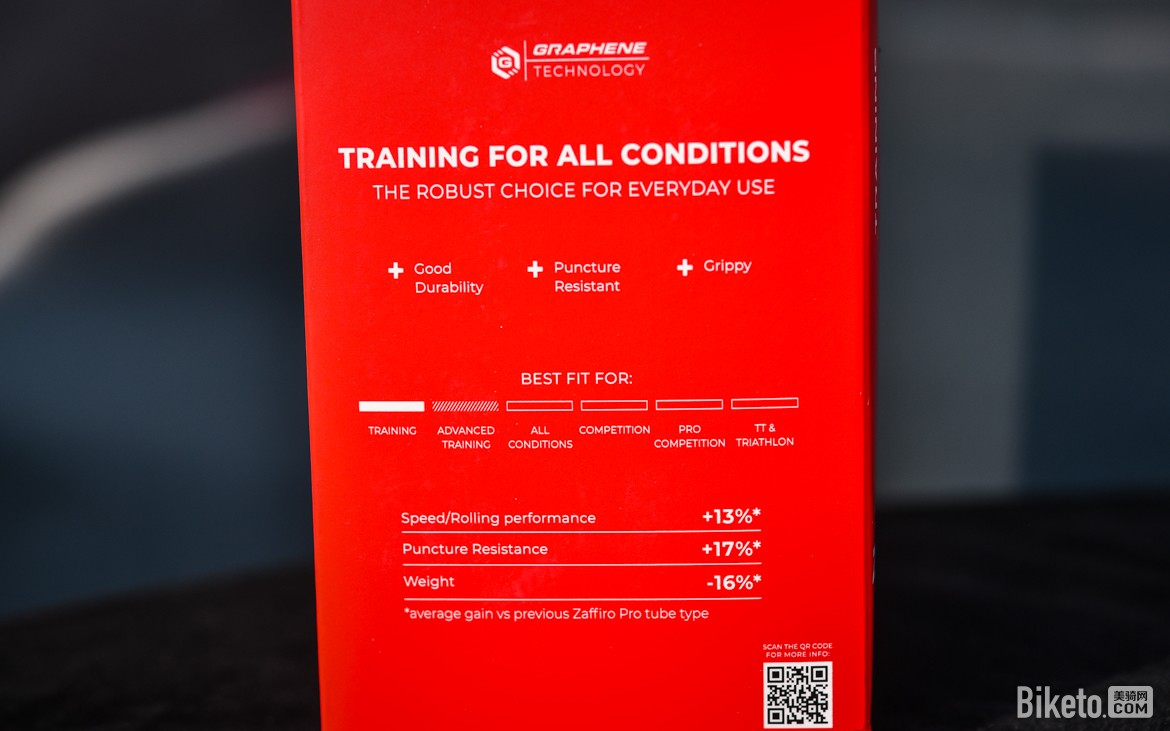 另一侧则是产品特性,Zaffiro Evo作为一款全季用训练胎,轮胎性能自然是侧重使用里程、防刺性能和抓地力。对比上一代产品,Zaffiro Evo的滚阻降低了13%、防刺性能增加了17%,同时重量还降低了16%。