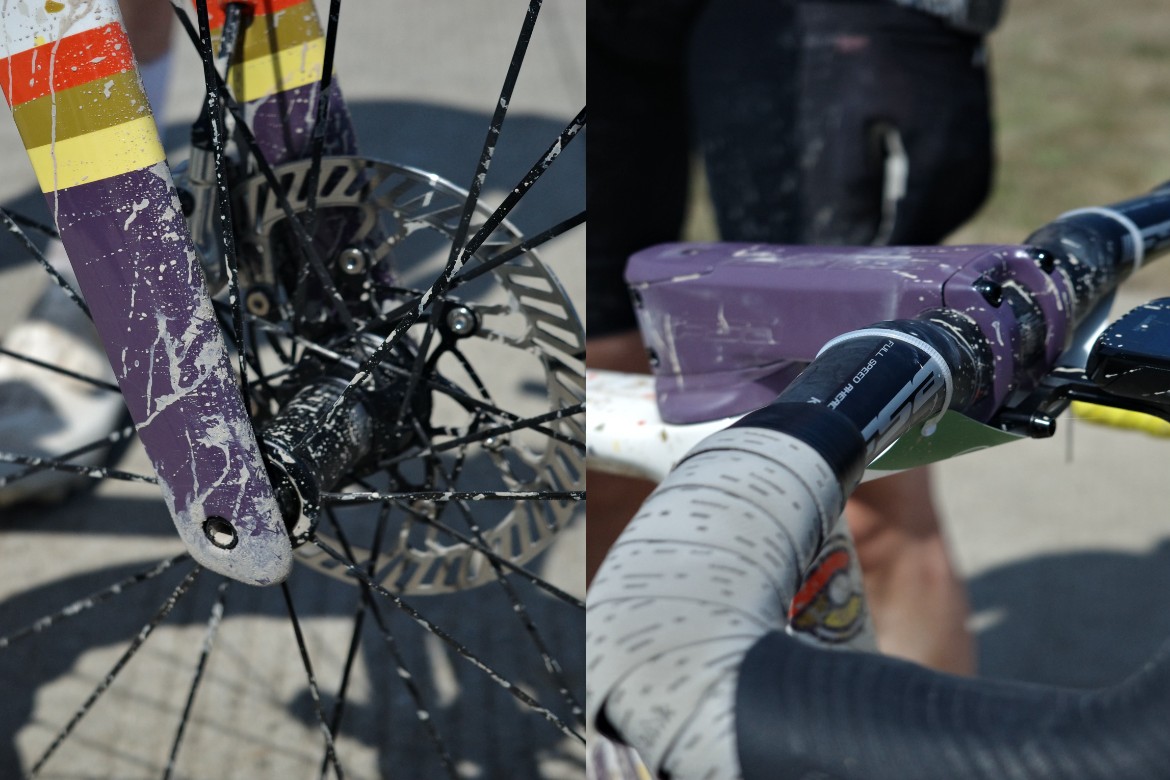 说到定制,豆总的这台Cinelli King Zydeco 2绝对是全场焦点。标志性的大落差+高框轮组是豆总的“防伪标签”。比起硬核配置,这台车的涂装更值得一提:以 Cinelli LOGO 三原色为基底,加入潘通 7666C 紫色提亮,灰白底色上的四色碎片完美契合 Gravel 的随性不羁,再配上定制色破风牙盘、紫色座管与弯把,无论复杂度还是完成度都堪称天花板。