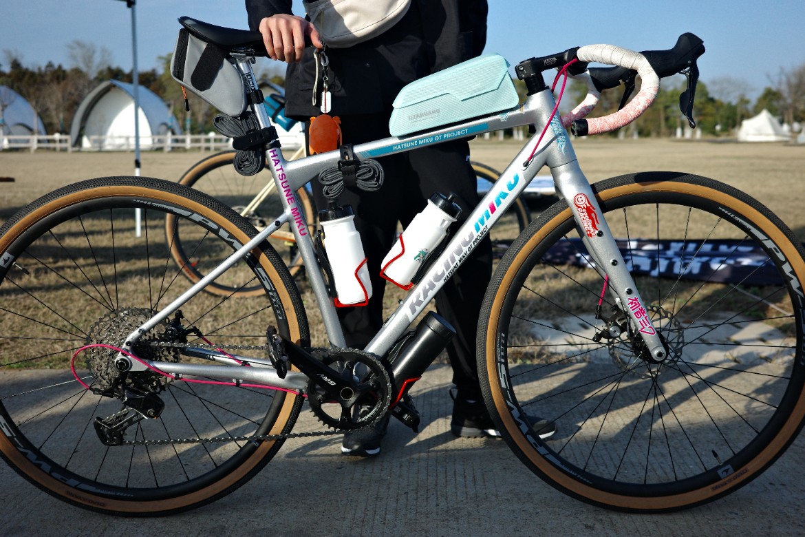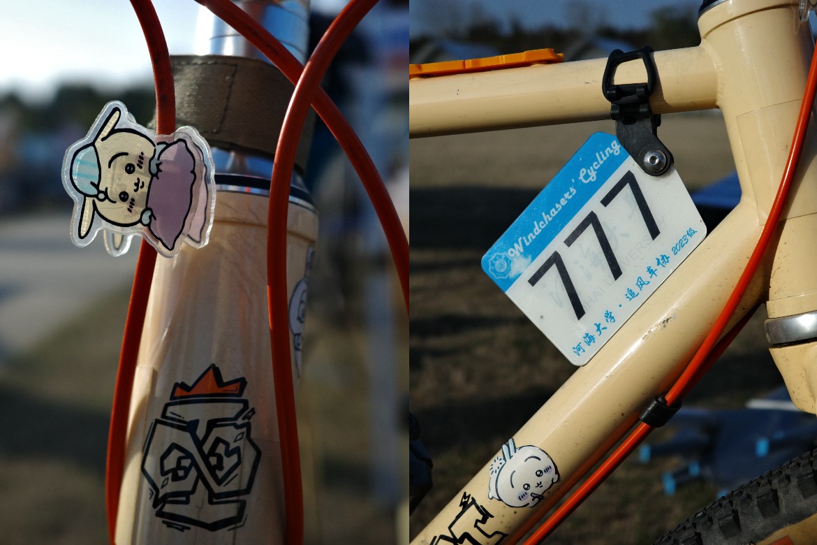 同样来自河海大学的凉橋春日同学有着和李同学完全不一样的组车思路。他选择的是Cannondale Topstone铝架瓜车,车架上全是HATSUNE MIKU(初音未来)的设计元素。同样的线拉碟和博力为机械后拨。但和他同学不一样,小哥没有使用真空胎,而是用了38c的朝阳开口瓜胎。