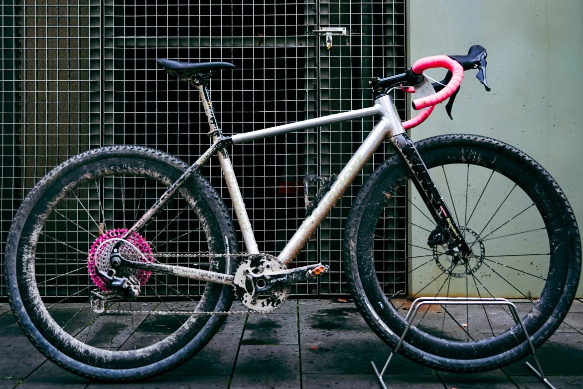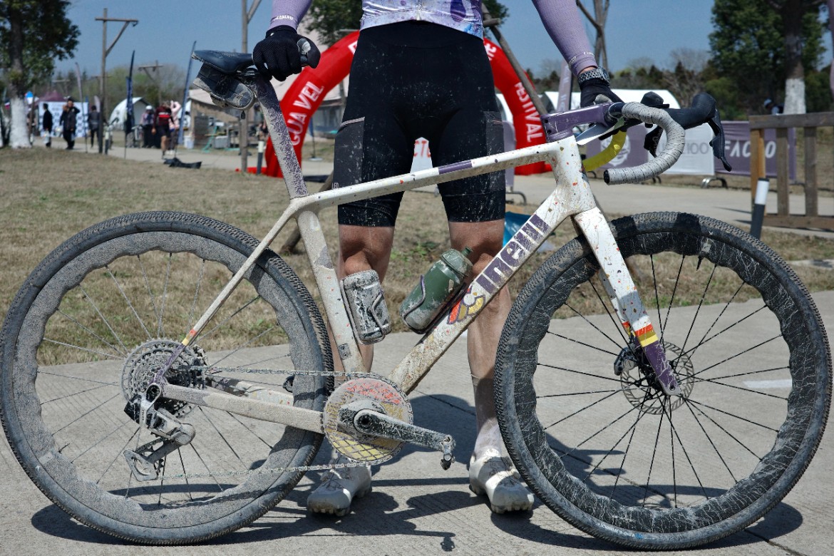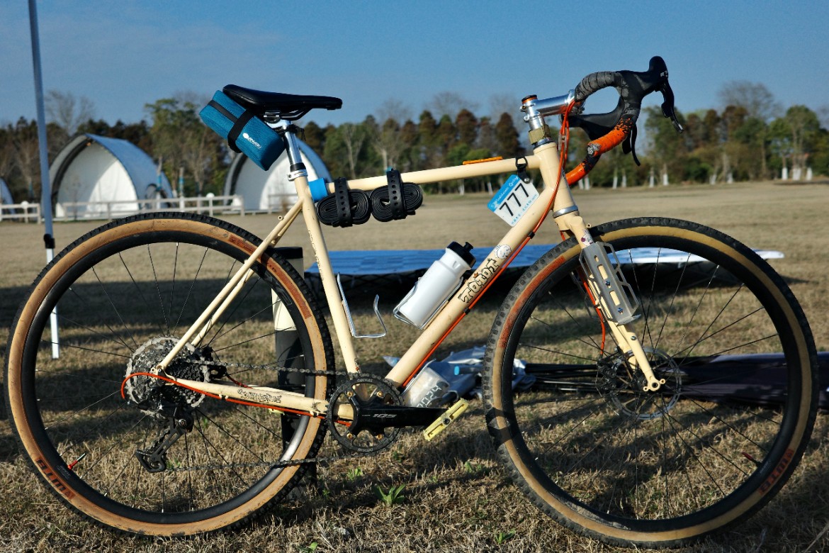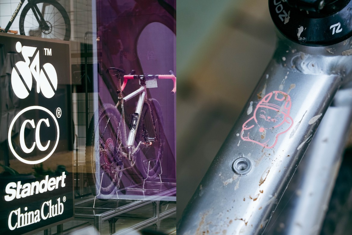 这次赛场出现了各式各样的金属架 Gravel,自然少不了 Standert 的身影。申 Pro 这次骑着 Standert 的铝合金瓜车 Kieswerk 完成了全程的比赛。虽然是金属瓜,但 Kieswerk 支持机械内走,使整车搭配了 GRX 1X 机械套件依旧简洁利落,粉色超大飞轮堪称点睛之笔。Kieswerk在德语里是采砂场的意思,上管的工人形象Lucky cat也与车名含义相呼应。